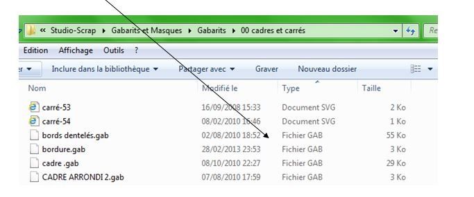 Ensuite, il faut différencier les « GABARITS » : ce sont les formes proposées par Studio Scrap, en format SVG, ou que nous avons modifiées en déplaçant les points, et enregistrées en format GAB